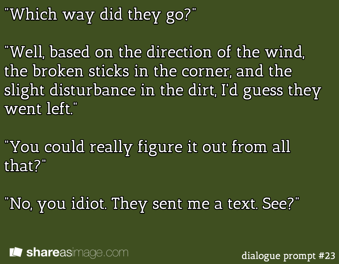 Daily Writing Blurb Get link Facebook X Pinterest Email Other Apps November 09, 2016 "But why would they text you?" "Don't be a jealous idiot. Just go left." Find this blurb on Pinterest! Prompt: Found on Stencil. Get link Facebook X Pinterest Email Other Apps Comments